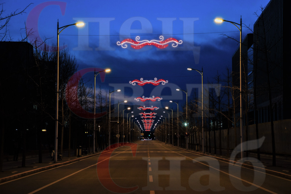 - Между световыми столбами: Это классический и очень эффектный вариант. Перетяжки, натянутые над улицами, создают ощущение праздничного коридора, направляя взгляд и подчеркивая торжественность момента.